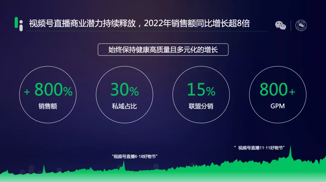 数据不算惊艳,但晋商行的用户价值变现却颇为稳健。“第一步,我们会通过视频号的直播间和短视频触达用户,一部分直接下单成交,一部分沉淀到公众号和企业微信中;第二步,有交易需求的用户,我们会筛选出来引导成交,没有交易需求的,我们会统一沉淀到公众号中,通过广点通变现。”刘斌说,晋商行以公众号起家,这让他们积累了丰富的微信生态运营经验,有着更高的用户变现效率。“一些人可能觉得2万视频号粉丝不如2000抖音粉丝值钱,但我们就有办法借私域把这些还没有强烈购买需求的粉丝变现。”据腾讯公开数据,2022年,私域贡献了30%的视频号直播总GMV。图源:微信公开课对比微信和抖音,会发现两者完全不同的平台风格。岳厂长评价,“视频号的赋能能力要大于治理能力。抖音的治理能力超强,一有成功案例就会被公布出去让所有人学习,大家都只能赚短期的钱,特别卷。”在刘斌看来,抖音就像一个庞大的公共渔场,所有人一起在里面养鱼。有人即使不养鱼,也可能捞到大鱼;有人辛苦养鱼,却可能一无所获。微信则由一个个私人渔场组成,每个人都有自己的一小块渔场,需要自己养鱼、捞鱼。好处是,鱼是自己的,没人抢;坏处是,渔场里很难养出大鱼。对晋商行来说,视频号就是公众号之后又一个新的微信流量入口,作用是继续往自己的微信渔场里加水、加鱼。“目前视频号的涨粉效率比公众号更高,同样一个10万+作品,视频号涨粉5000掉粉100,公众号涨粉3000掉粉600”,刘斌补充。值得注意的是,私域并不全是好处。如果说爆款内容、付费投流考验的是创意能力、资源能力,那视频号+私域考验的就是精细化运营能力。这也是不少玩家在视频号铩羽而归的原因。私域是否有更高的商业效率,是否能形成足够标准可复制的玩法,是否能吸引足够数量的玩家入局,决定了视频号的商业上限。“基于微信的社交媒体优势,视频号是离人最近,触达率、准确率最高的媒介。”郭勤认为,视频号也许在爆款出圈的频次上暂时没有优势,但基于社交圈层的瞬间爆发和长尾效应非常强。“视频号每一个播放都可能来自点对点的直接转发推荐,这也是视频号真人社交的独特之处。举例来说,头部视频号达人‘意公子’从中国传统文化切入,用通俗、走心、娓娓道来的形式解读中国艺术及历史人物,这让她触达到了各类传统文化爱好者,这些人也会通过点赞、转发将内容传播给身边的同好,持续产生关注和二次分享行为。”背靠国内主流社交应用微信,视频号不仅有机会触达几乎所有国内用户,基于熟人关系的社交传播,也让视频号拥有超过其他平台的圈层放大效应。值得注意的是,虽然视频号理论上能实现更精准、高效的传播,但因为生态链路尚不完善,无法有效跟踪在朋友圈、社群、私信等圈层内的社交互动,视频号有别于其他平台的社交价值没办法准确衡量,导致品牌很难准确分析视频号真正的投放收益。这也是视频号广告遇冷的原因之一。大部分从业者都相信视频号具备独特的社交价值,但社交价值能创造多少真实商业回报,目前仍是一个黑盒。业内对视频号的价值衡量往往基于微信展开。有从业者曾开玩笑说,微信月活13亿,如果全部导给视频号,超过抖音、快手不是分分钟的事情?但当视频号隐约成为第三大短视频直播平台时,微信的存在就颇为微妙。如果把抖音比作一个以短视频直播为根基的独立帝国,那视频号顶多算是一个依托于微信社交帝国的诸侯国。此前张小龙在微信公开课上也透露,短内容是微信一直要发力的方向,视频号则是微信在短内容上的补充。因此,罗峰觉得,视频号仅仅是微信的一个功能而非独立产品,商业上限并不高。刘斌认为,社交和电商是个天然矛盾体,并不兼容。“所以你会发现在视频号能卖得动的产品都有一定的社交属性,比如滋补养生、私人定制类产品。”有人不看好也有人看好。郭勤认为,就像微信孵化出微信支付一样,视频号未必不能裂土封王。“微信厉害的地方是,它的流量别人抢不走。基于微信的视频号,它的内容消费时长应该会越来越高。”视频号始终是微信的视频号,这也影响着外界对视频号商业价值的判断。对长期主义者来说,私域、社交、微信生态构成了视频号的庞大想象空间,但因为没有足够的案例、数据、方法论验证,暂时也只能限于想象。“我感觉视频号很有戏,但就是看不懂、玩不转”,这可能是不少玩家对视频号的看法。郭勤觉得,互联网行业高速增长的时代已经过去,且不同平台在定位、目标人群上各有差异,视频号很可能还是会按着自己的节奏发展,不适合与其他平台过往的规模增长速度直接比较。细究外界对视频号颇显急躁的期待,本质上是希望视频号能复制抖音、快手等平台的流量红利。随着互联网下半场到来,作为最后一块流量洼地,视频号承担了太多期待。但这更像是一种红利饥渴症,是风口过后的无所适从。就算视频号真爆发了,从业者的问题就解决了吗?要知道,抖音、快手等平台崛起的时候,仍然有大量痛骂平台的失意者。流量红利更像是一场赌博游戏,在少数幸运儿的示范下,越来越多人期待能踩着风口逆天改命。很多人可能忘了,风口、红利从来都是暂时的,也多属于少数人。4月27日,珠宝品牌宝石小满创始人胡鑫发布第一条视频号作品,开始运营个人IP“珠宝学姐-三金”。在线下做珠宝创业3年后,